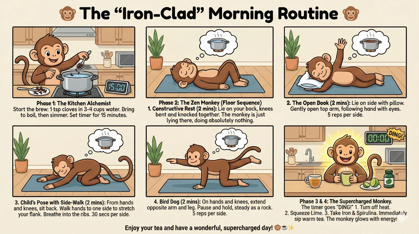 The timer goes ´DING´ 1.Turn off heat. 2.Squeeze Lime. 3.Take Iron& Spiruline. Immediately sip warm tea. The monkey glows with energy!